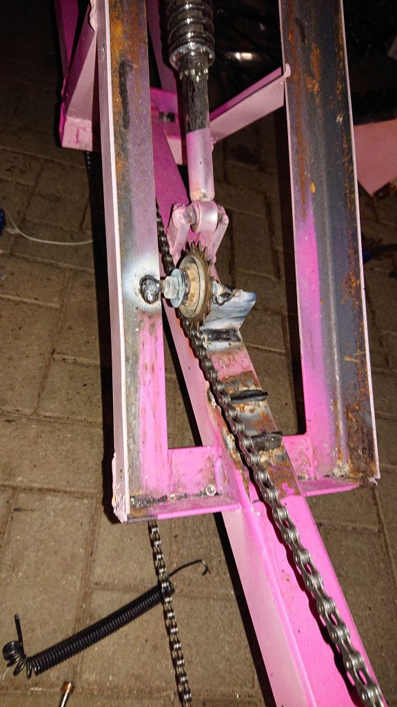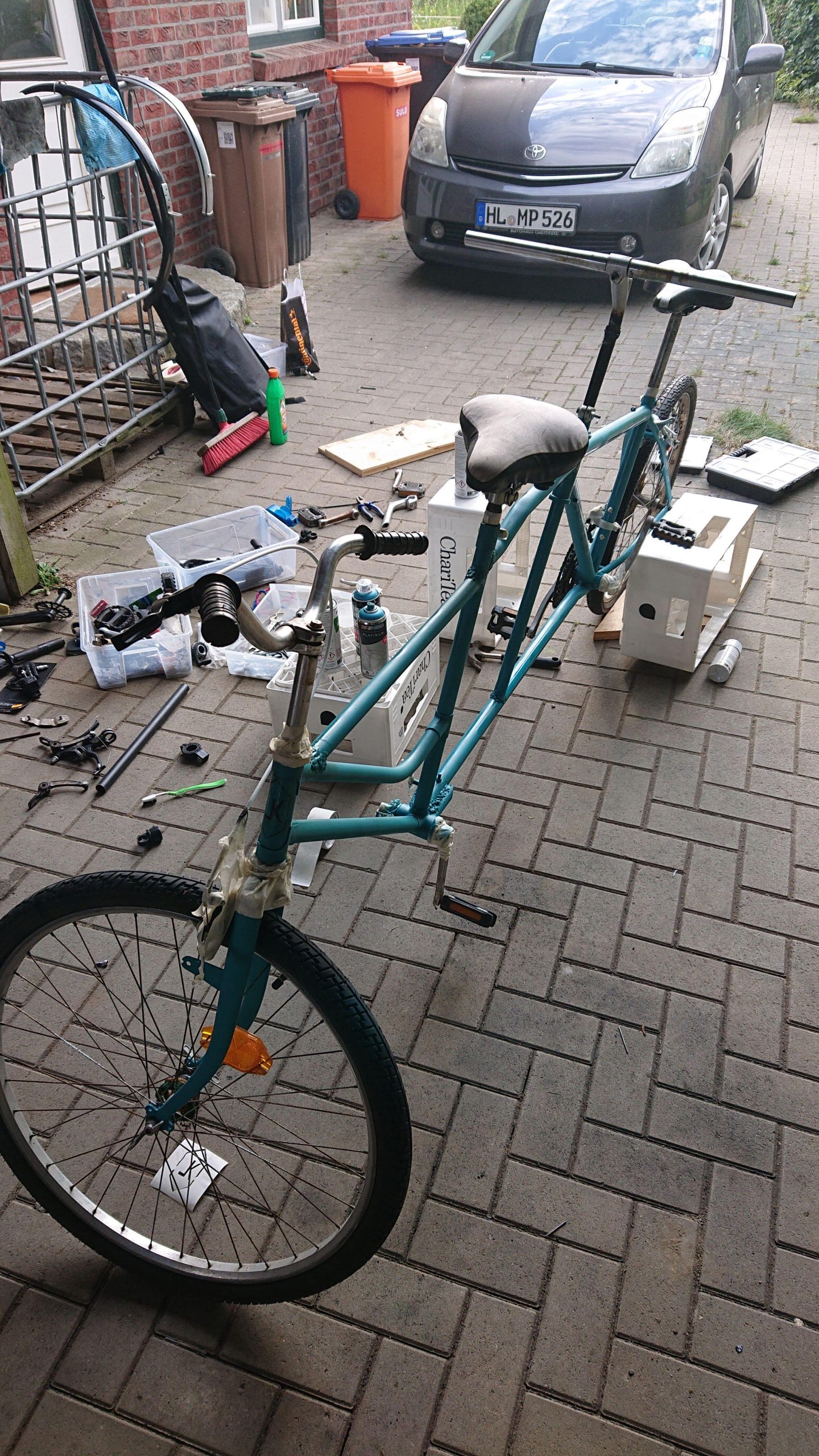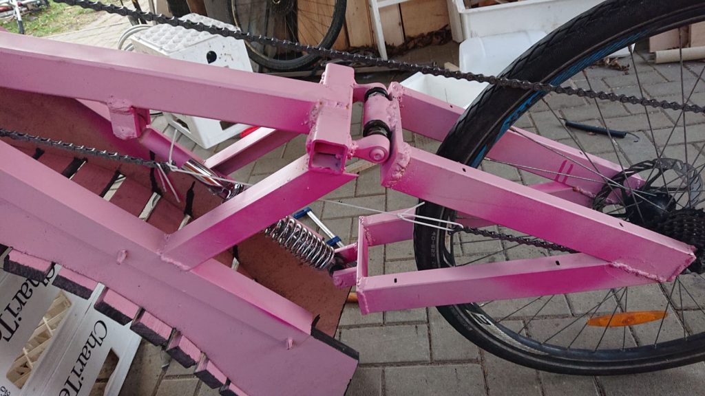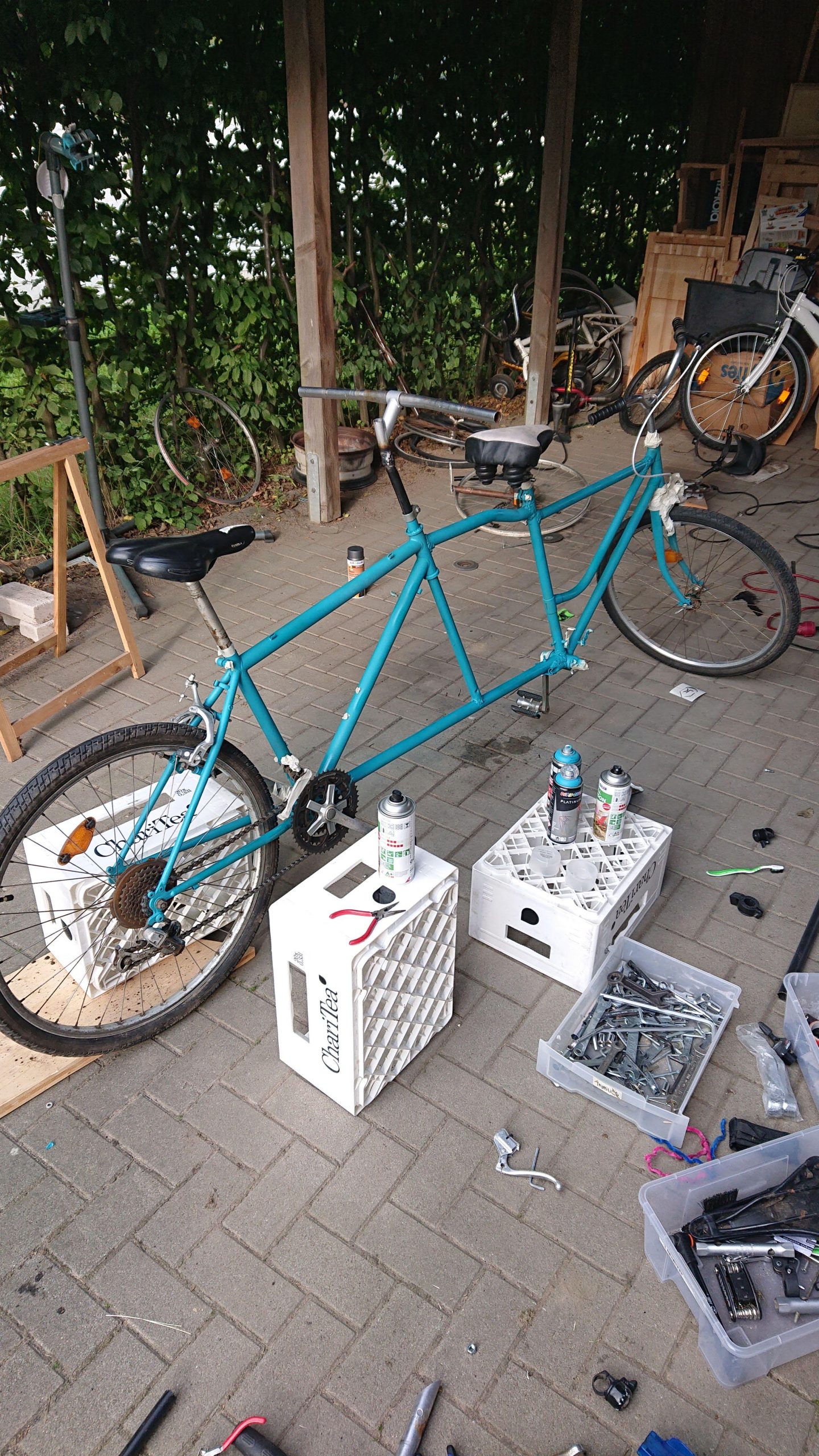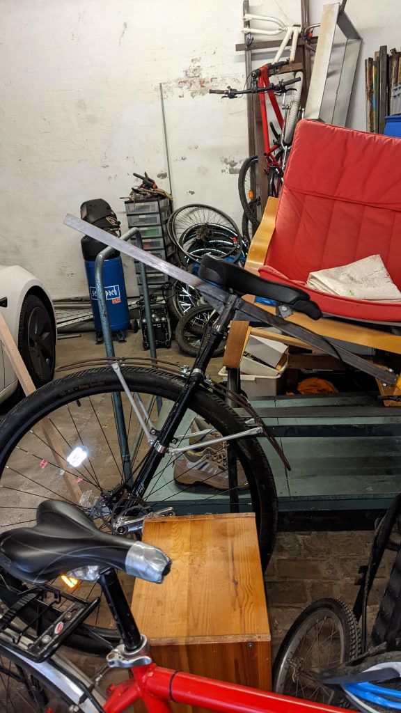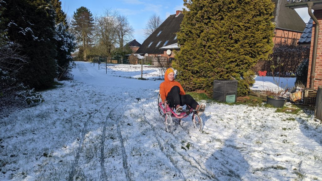 Im Winter, wenn es rutschig ist, sind zwei Räder schnell problematisch. Mit einem dritten ist umfallen aber sofort ein Problem der Vergangenheit. Das Liegetrike entstand im Winter 2021 aus Reststahl, einer Mopedfeder und zwei Puky Kinderfahrrädern für die Lenkung.