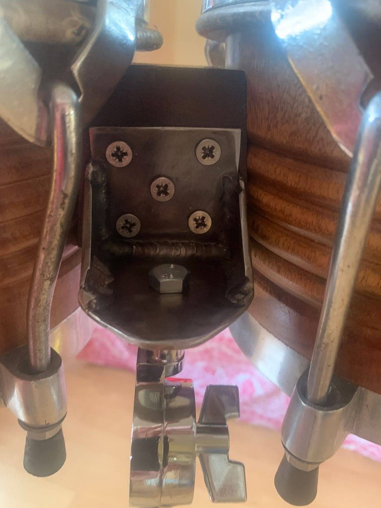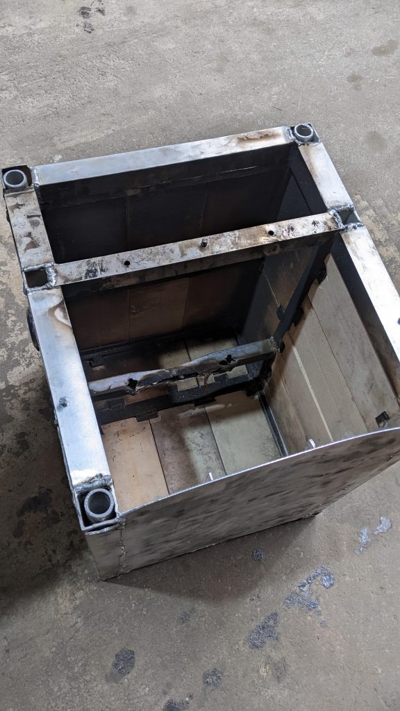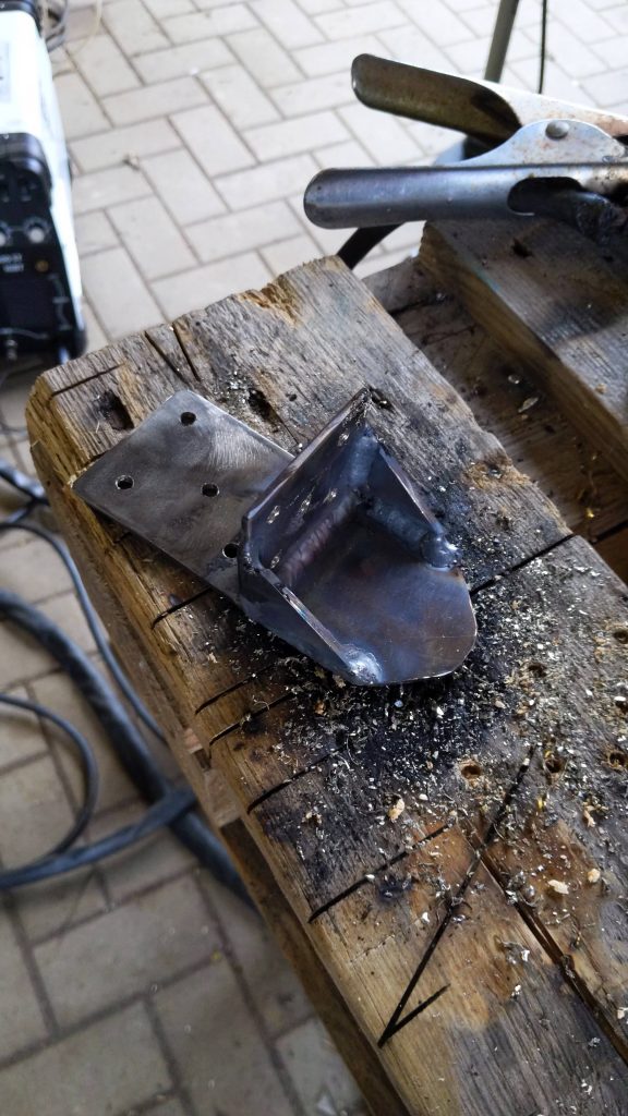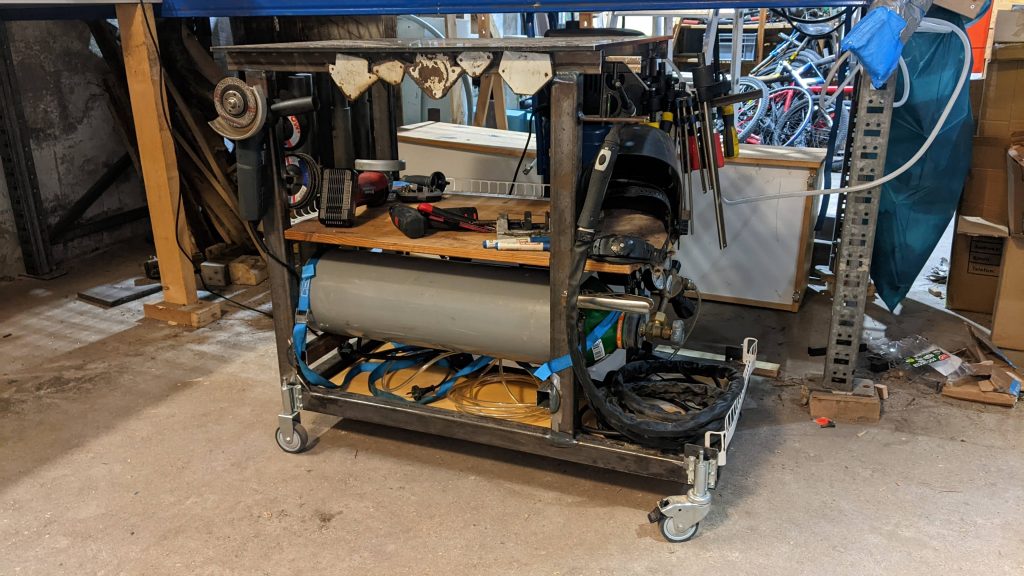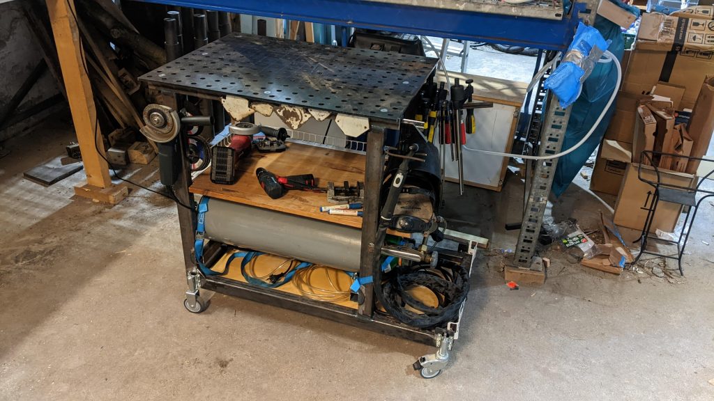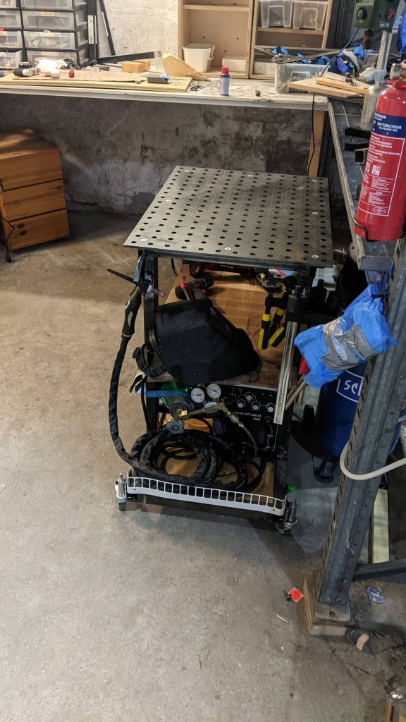 in kleiner mobiler Tisch mit 8 mm starker Arbeitsplatte mit 16 mm Löchern zum Klemmen befestigen. So lassen sich Metallgegenstände wunderbar einspannen bei schweißen, um Verzug zu verhindern.