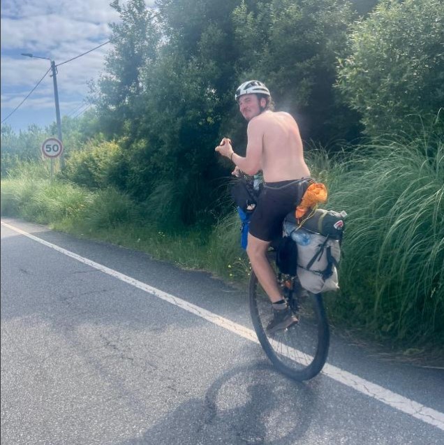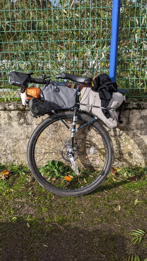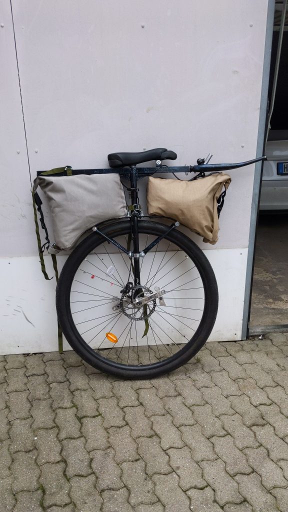 Um auf Einradreisen keinen schweren Rucksack tragen zu müssen, baute ich 2023 ein Gestell, an das ich selbstgenähte Taschen hängen kann, in denen ich Camping und Kochgeschirr, wie auch Klamotten und Elektronik sicher verstauen kann. Mit diesem Setup bin ich 2023 die französische Westküste entlang gefahren und 2024 entlang der Küste und durch die Berge Portugals.