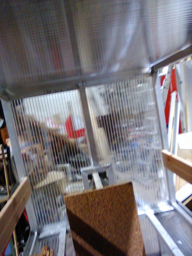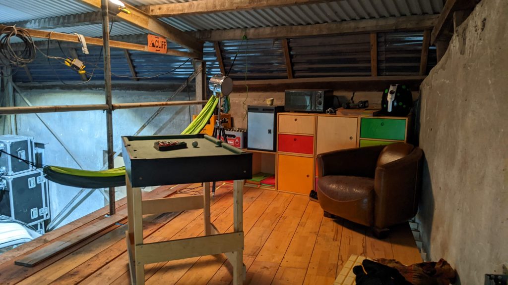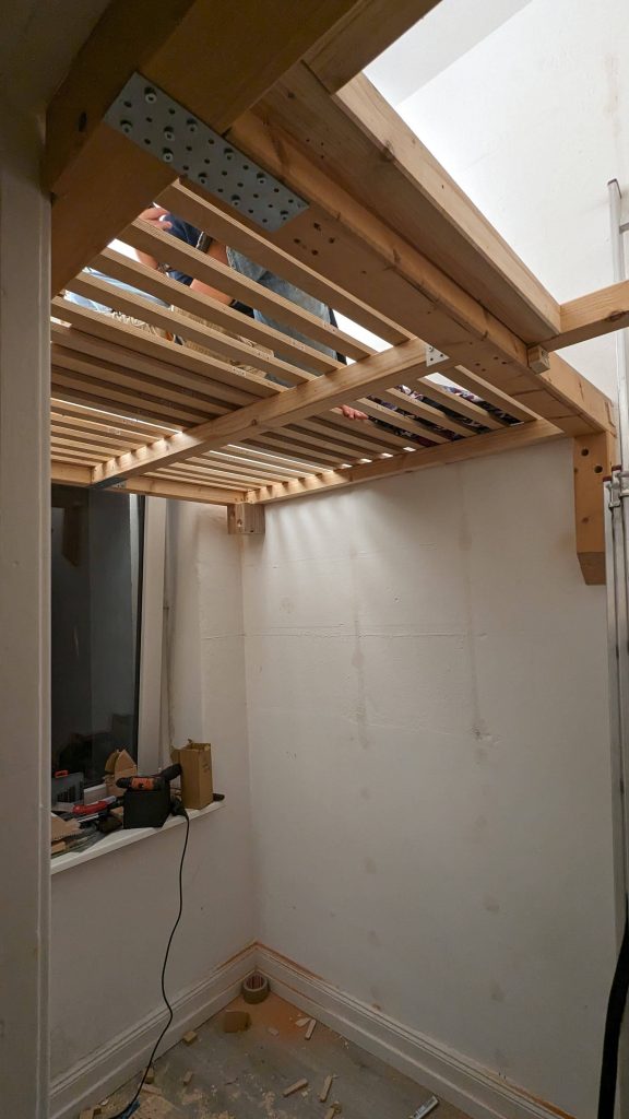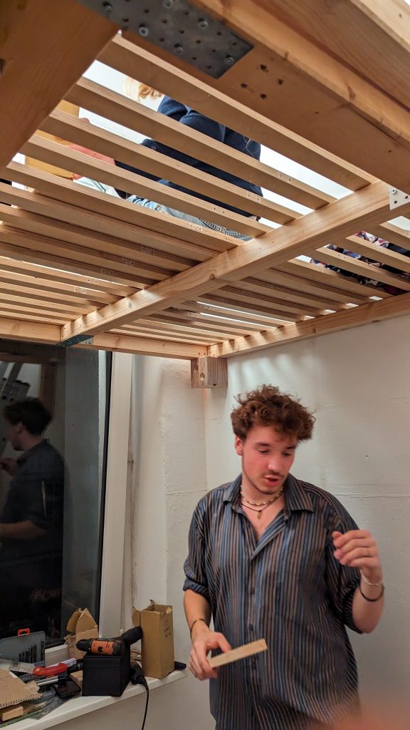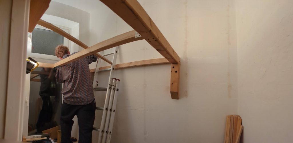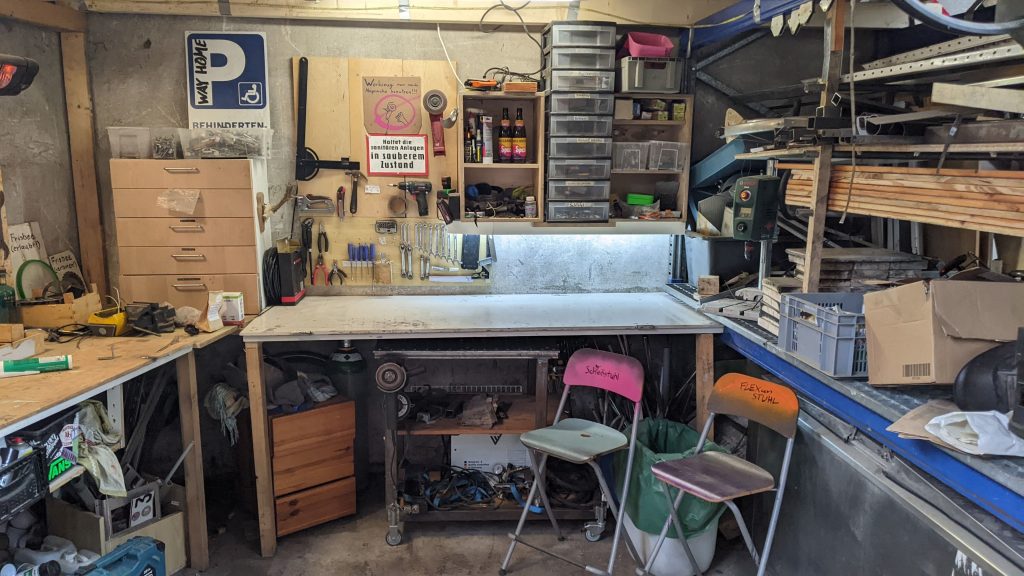 Um mehr Platz in der Werkstatt zu haben, haben wir eine Plattform eingezogen, die an der Wand und einem Schwerlastregal befestigt ist.