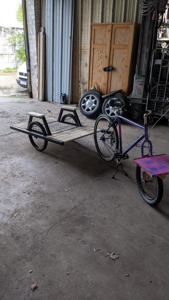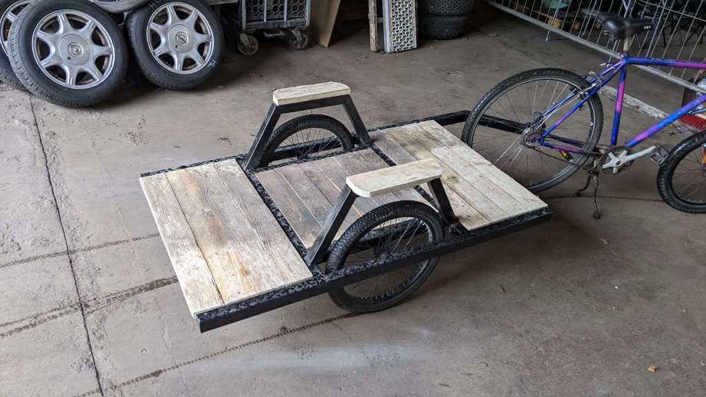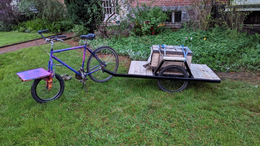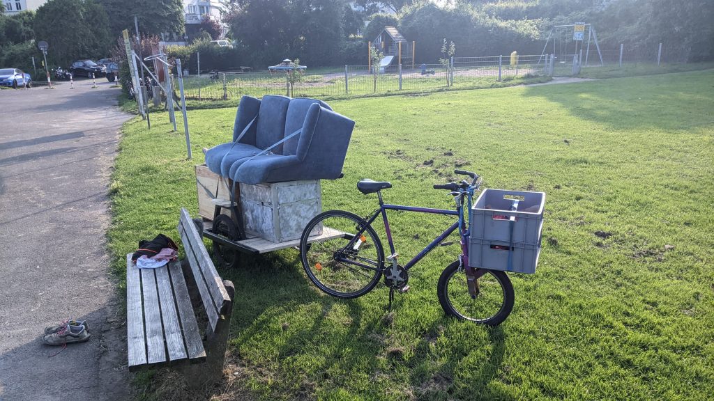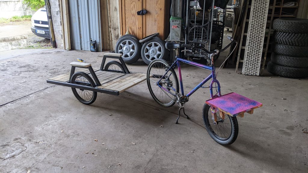2024 habe ich einen stabilen Anhänger gebaut und verschiedene möglichst stabile Aufhängungen ausprobiert. Mit dem Anhänger kann ich extreme Lasten transportieren, was viele meiner Projekte überhaupt erst ermöglicht. Ende 2024 bin ich sogar ausschließlich mit meinem Fahrradanhänger umgezogen.